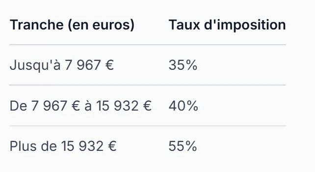 - Barème Progressif : La somme après abattement est imposée au barème progressif prévu pour les donations en ligne directe. Les taux d'imposition varient en fonction du montant de la donation et du degré de parenté.
