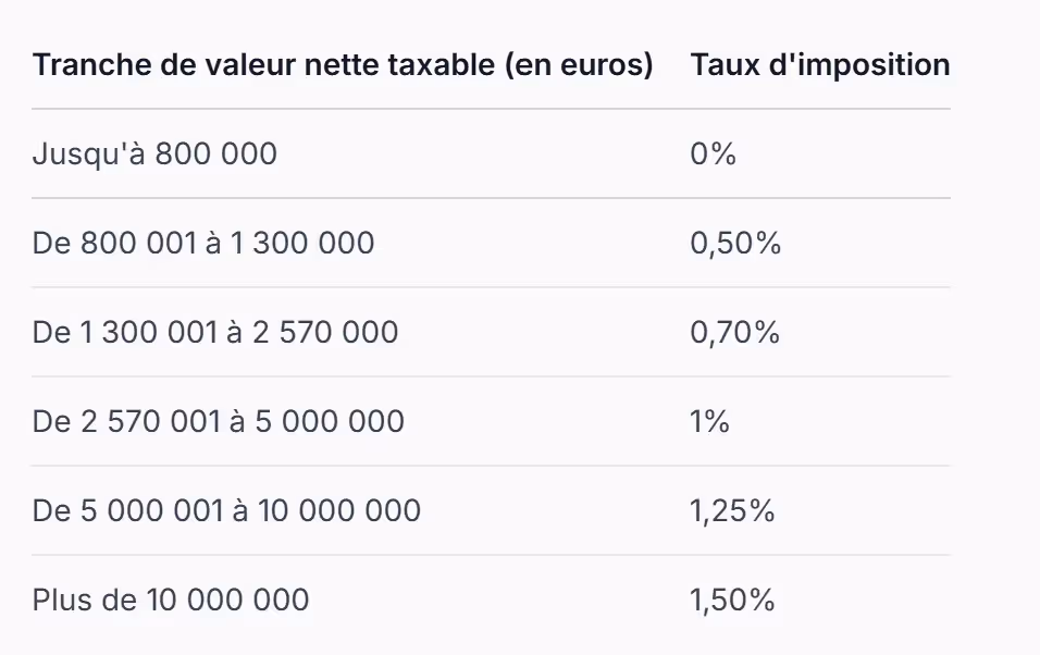 Tranche de valeur nette taxable (en euros)Taux d'impositionJusqu'à 800 0000%De 800 001 à 1 300 0000,50%De 1 300 001 à 2 570 0000,70%De 2 570 001 à 5 000 0001%De 5 000 001 à 10 000 0001,25%Plus de 10 000 0001,50%