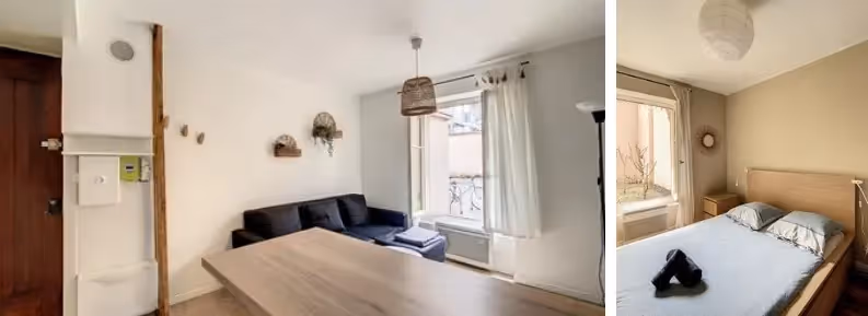 - Prestations : Cuisine meublée et équipée ouverte, chambre avec salle d'eau attenante, WC séparés avec coin machine à laver et cumulus.
