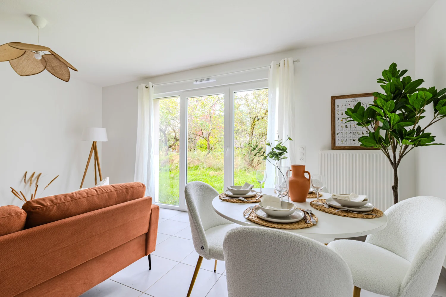 Les espaces extérieurs aérés, incluant un potager partagé et des arbres fruitiers, contribuent à l'atmosphère conviviale de cet ensemble résidentiel.