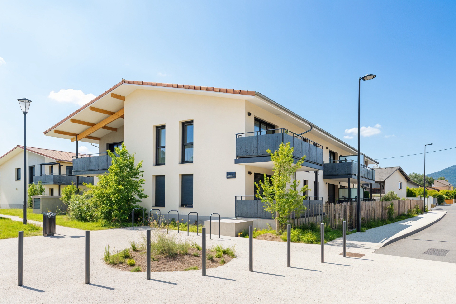 Les logements offrent des vues dégagées sur les massifs environnants. Chaque appartement dispose d'espaces extérieurs privatifs tels que balcons, terrasses ou jardins. Un garage fermé en sous-sol est inclus pour chaque logement.