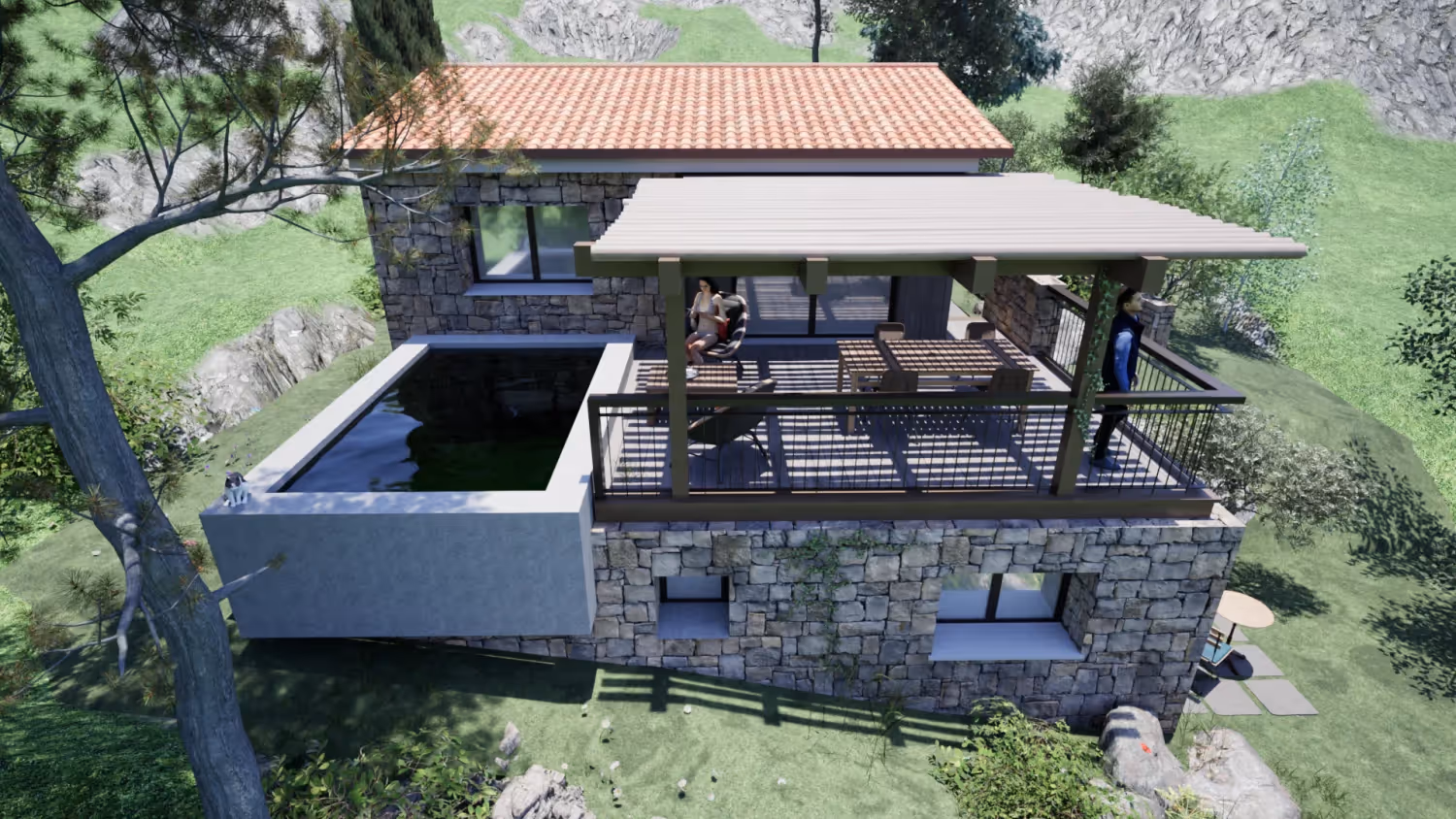 - Architecture : Construction en pierre respectant l'héritage corse (façades en pierre, tuiles canales, terrasses en bois).