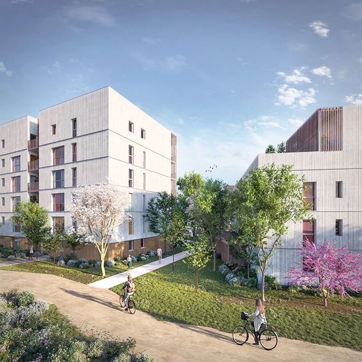 L'architecture de la résidence se distingue par un style sobre et contemporain. En accord avec la démarche environnementale globale de la ZAC, les constructions utilisent des matériaux durables visant à réduire l'empreinte carbone. Les façades sont habillées de lames de bois massif (cyprès et douglas), disponibles en teinte marron ou peintes en gris clair. Le bois est également employé pour les éléments extérieurs décoratifs comme les garde-corps, les pare-vues, les pergolas et les brise-soleils, assurant une composition harmonieuse.