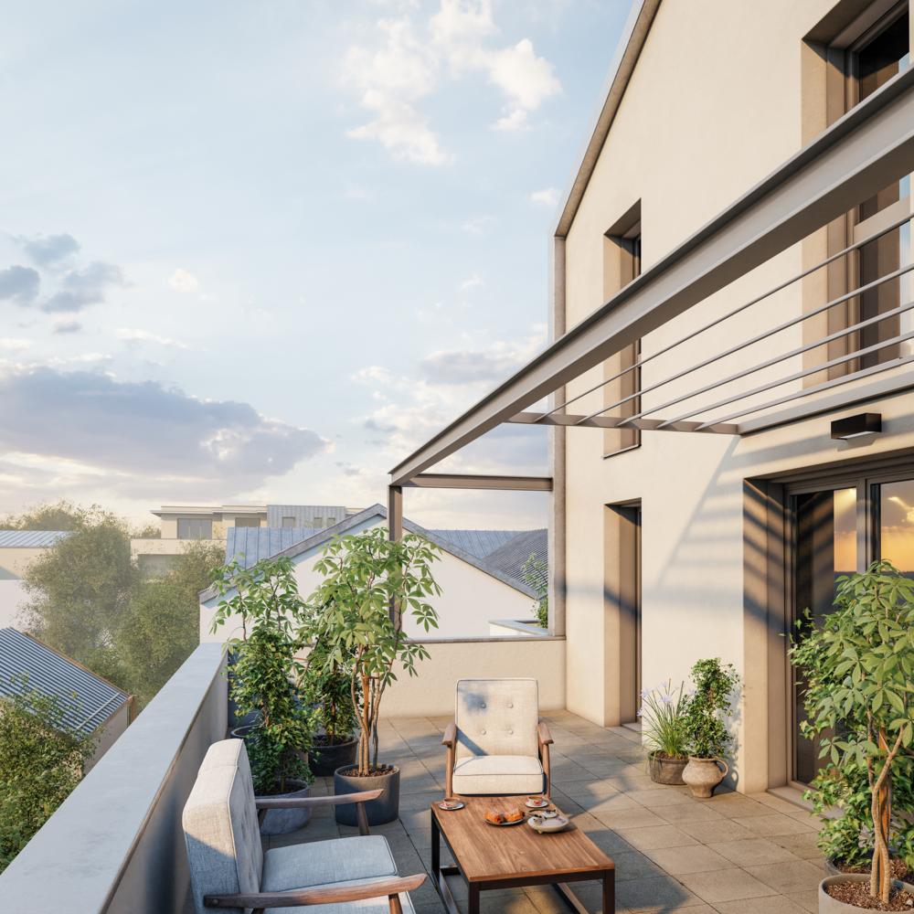 - Prestations extérieures : Espaces extérieurs généreux, cœur d'îlot végétalisé avec venelle piétonne, auvents collectifs et placette partagée.