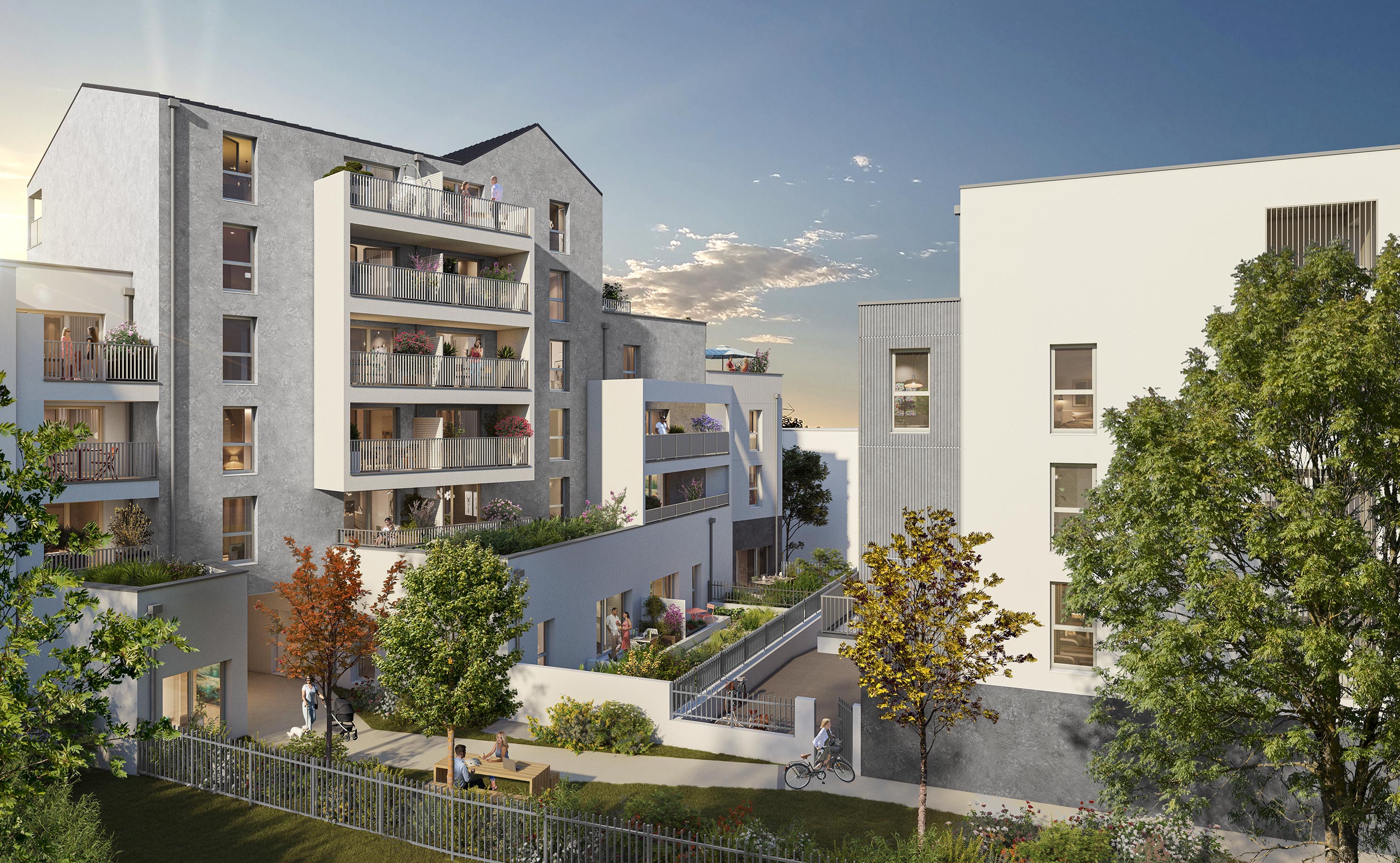 Les logements, allant du 2 au 5 pièces, incluent des appartements en duplex. Chaque habitation dispose d'un espace extérieur privatif, tel qu'un balcon ou une terrasse, et les bâtiments intègrent des toitures végétalisées pour une meilleure performance énergétique. Un cœur d'îlot paysager complète cet environnement.