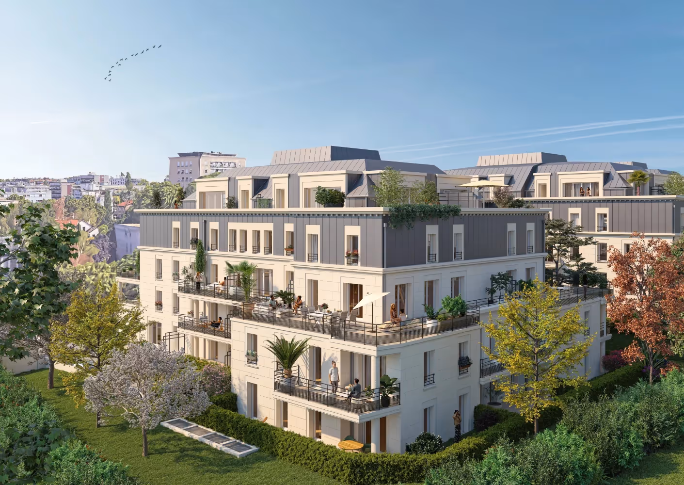 Un jardin intérieur paysager, agrémenté de platanes, crée une atmosphère paisible et offre des vues verdoyantes aux appartements environnants. Les espaces extérieurs privatifs tels que balcons, terrasses ou jardins ajoutent une dimension supplémentaire à l'art de vivre.