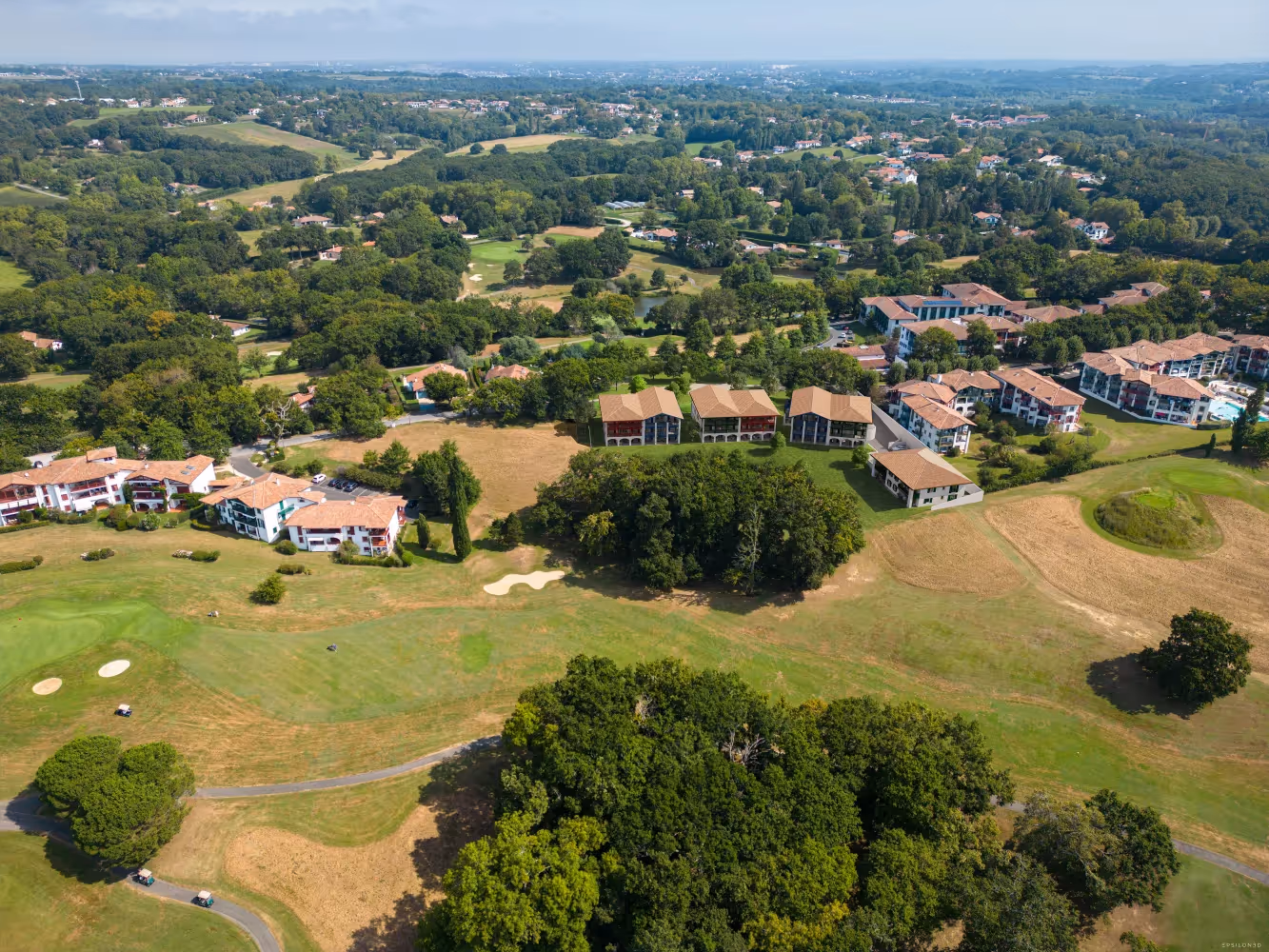 La résidence bénéficie d'un emplacement privilégié sur le golf, accessible par un cheminement doux qui prolonge l'axe historique de Jaureguiborda. Cette situation favorise les déplacements à pied vers les commodités du bourg et la forêt communale.