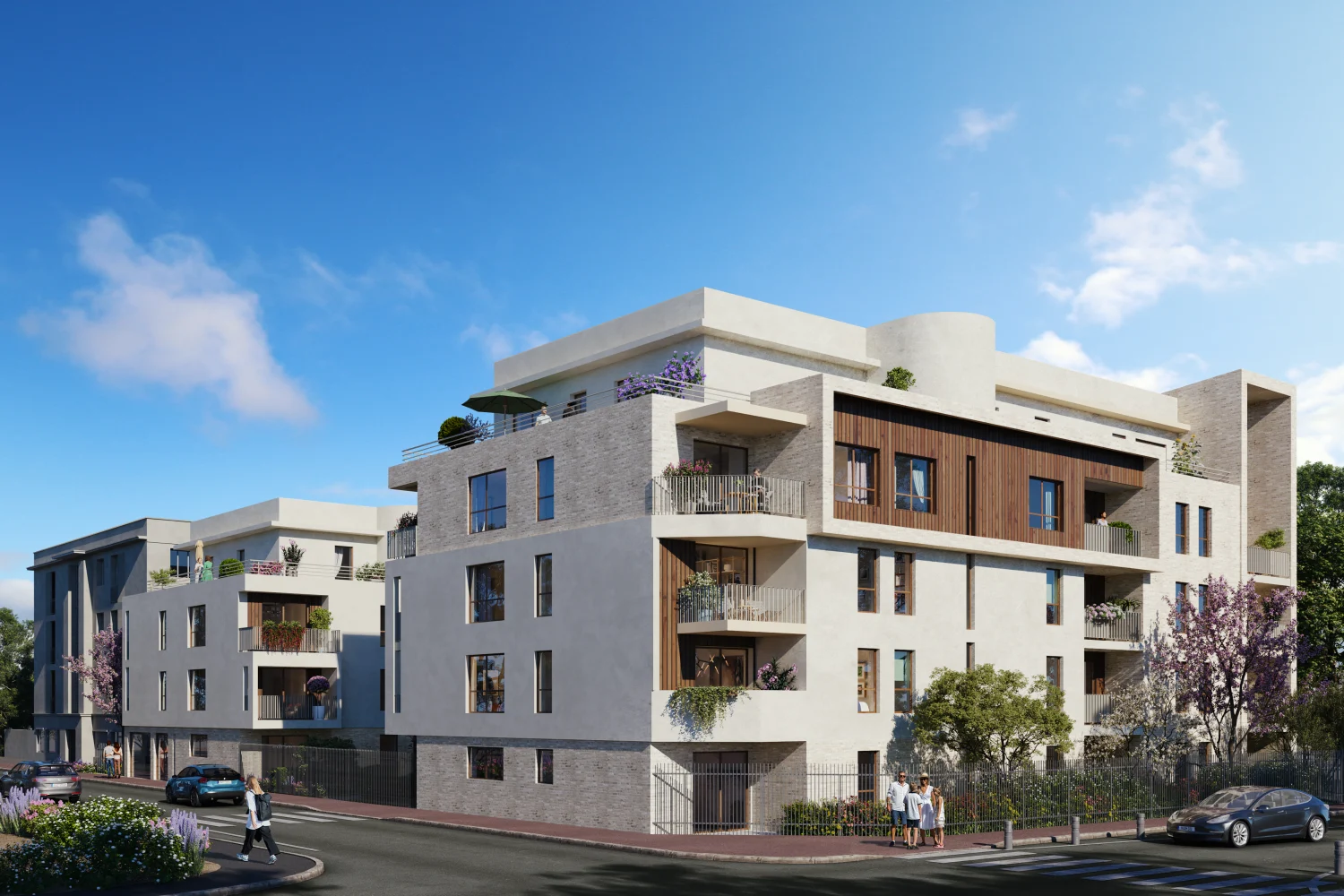 - Prestations extérieures : Toitures végétalisées, terrasses privatives et cheminement aménagé entre les deux immeubles.