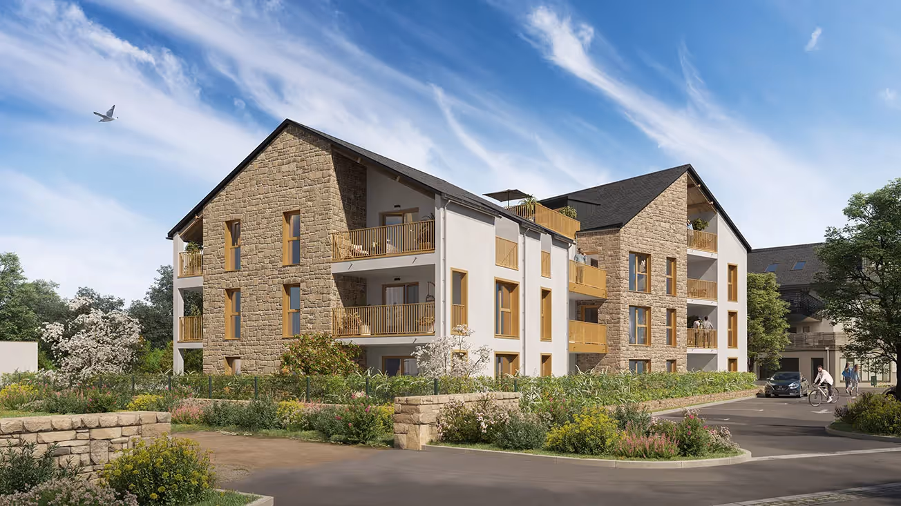 Ce programme immobilier se distingue par une architecture qui s'inspire des constructions traditionnelles locales, intégrant des parements en pierre rappelant les murets typiques de Plouharnel et des enduits aux teintes naturelles. Avec seulement deux niveaux (rez-de-chaussée et combles) et un aménagement paysager central, la résidence assure un cadre de vie à échelle humaine et préservé.